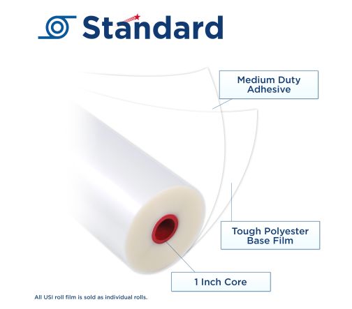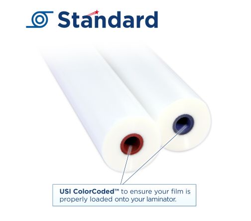 USI Standard thermal roll laminating film is a quality thermal roll laminating film. It is excellent for projects that have heavier ink coverage and need additional bonding strength. The adhesive bonds at 260-280 degrees (F)). Rolls of USI Standard film are Color Coded for easy installation and use.
